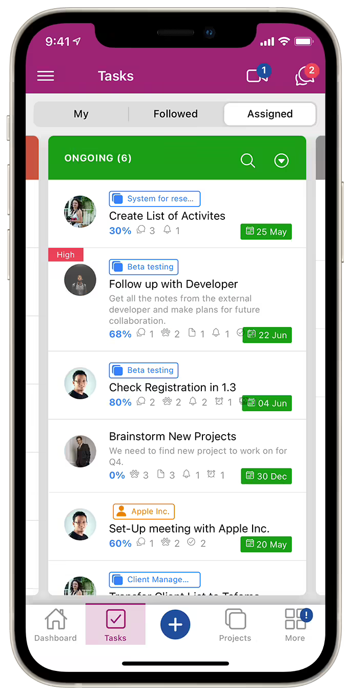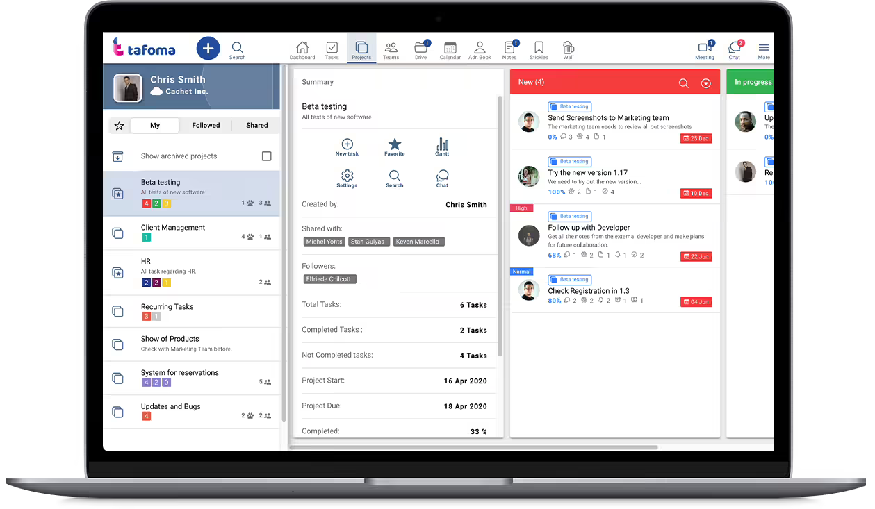 If you need an overview of all your tasks, you can do so easily with our projects feature; it enables you to create groups for connected tasks and view their progress. Projects is an accessible and efficient hub, where you can see how a project is coming along – from conception to completion. Tafoma saves you from cumbersome project management platforms, and is the ultimate cost-effective software for teamwork.